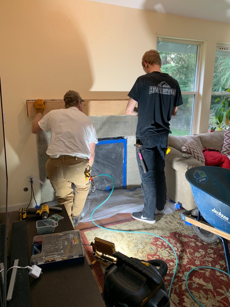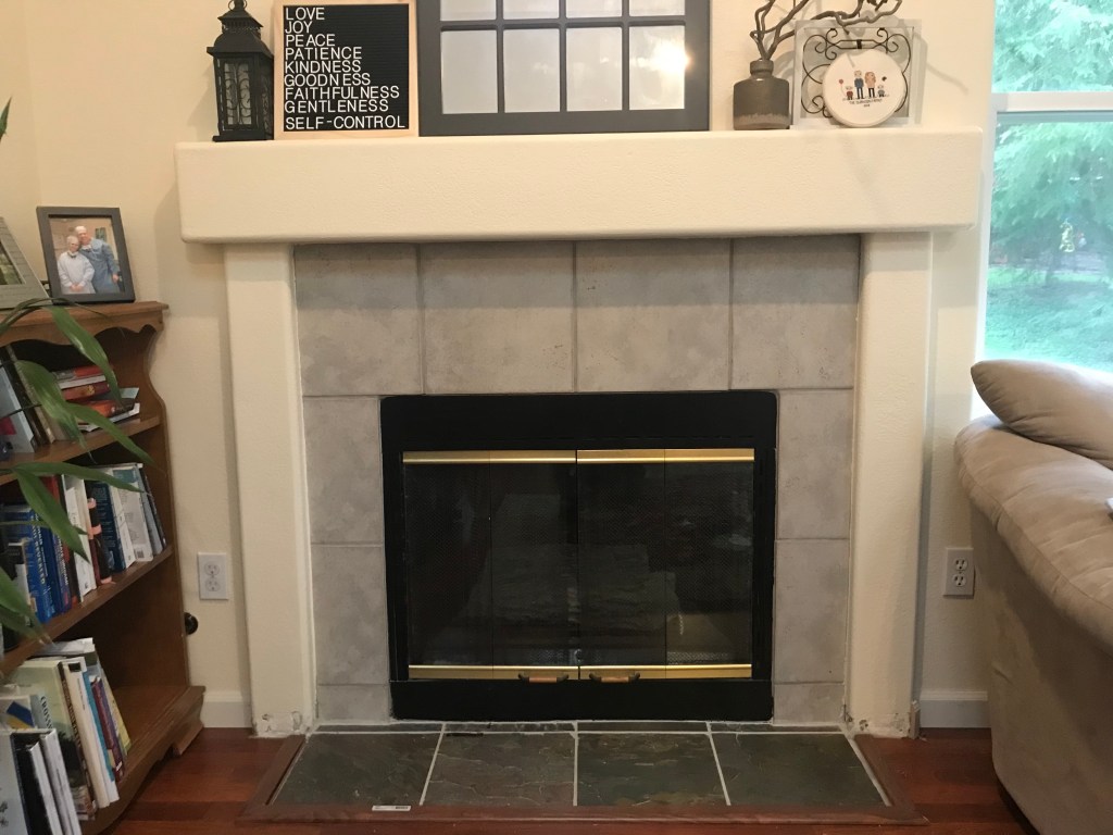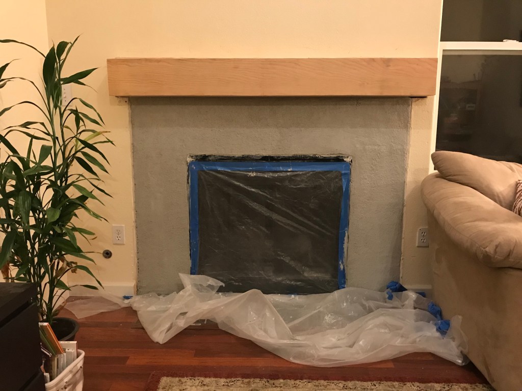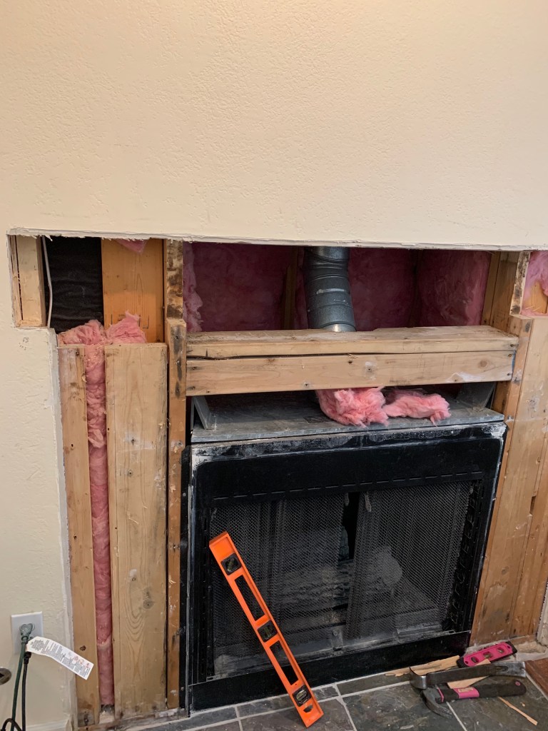 We originally were going to replace the entire fireplace unit until we found out it would be over $5000. After discussing it, we decided to save our money and keep the same fireplace unit. We painted all the gold parts black. We took hammers and crow bars and just started hitting! We taped plastic to the ceiling to make a “dust tent” to try to minimize demo dust.