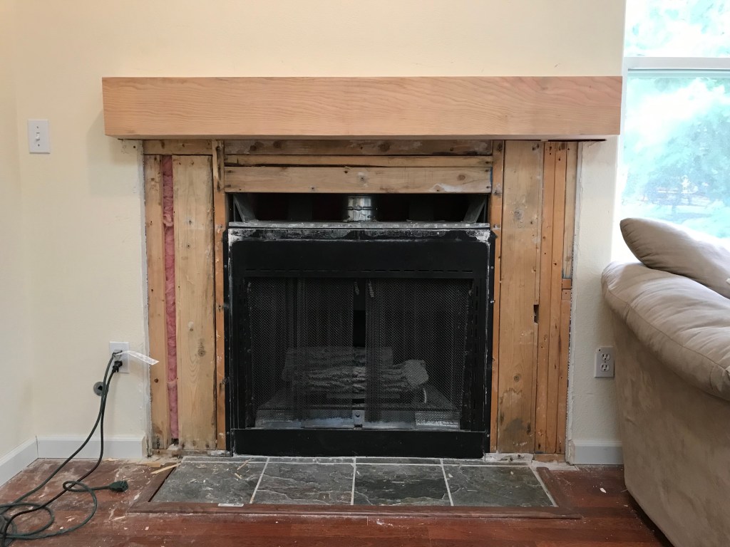 We looked at a lot of different options for mantle beams and ended up deciding on an 8″x8″ solid wood beam from Westside Building Supply. The beam cost $120 and my dad used a beam cutter to cut it to the correct length. The beam set into the wall about 2-3″.