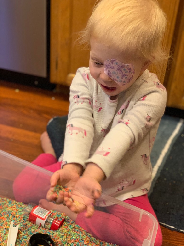 We’re taking a 4-6 month break from going to vision therapy sessions (as recommended by her vision therapist) to focus on just doing patched activities at home to try to continue to strengthen/maintain her right eye. We will continue to do 15-20 minutes every day at home!