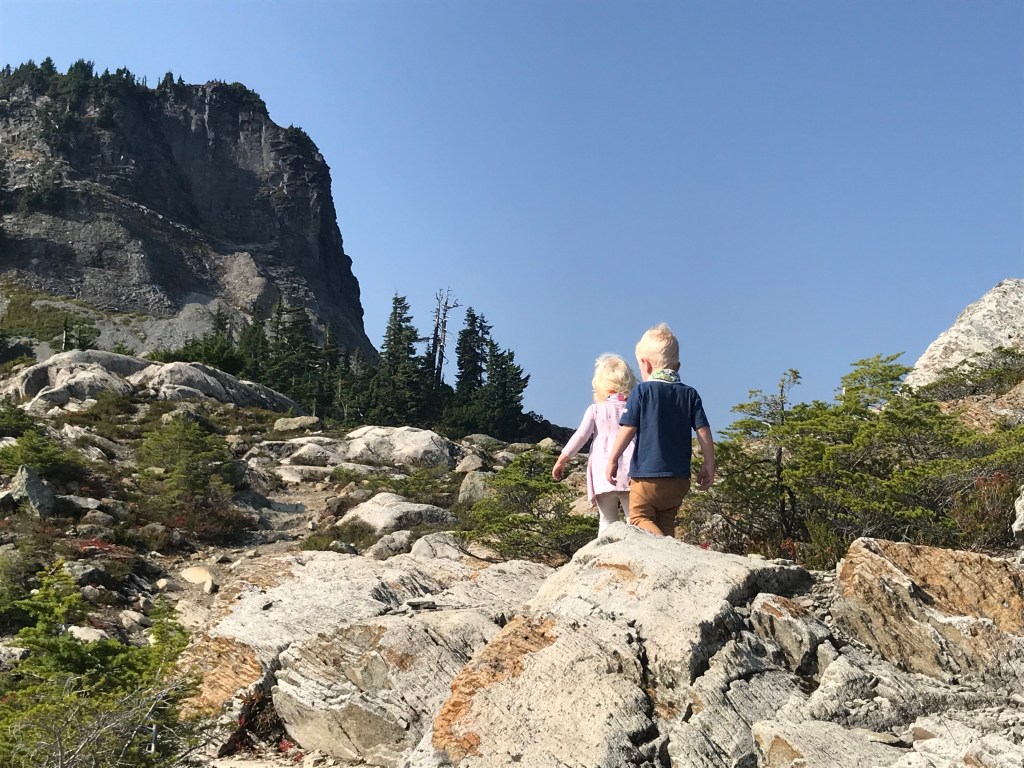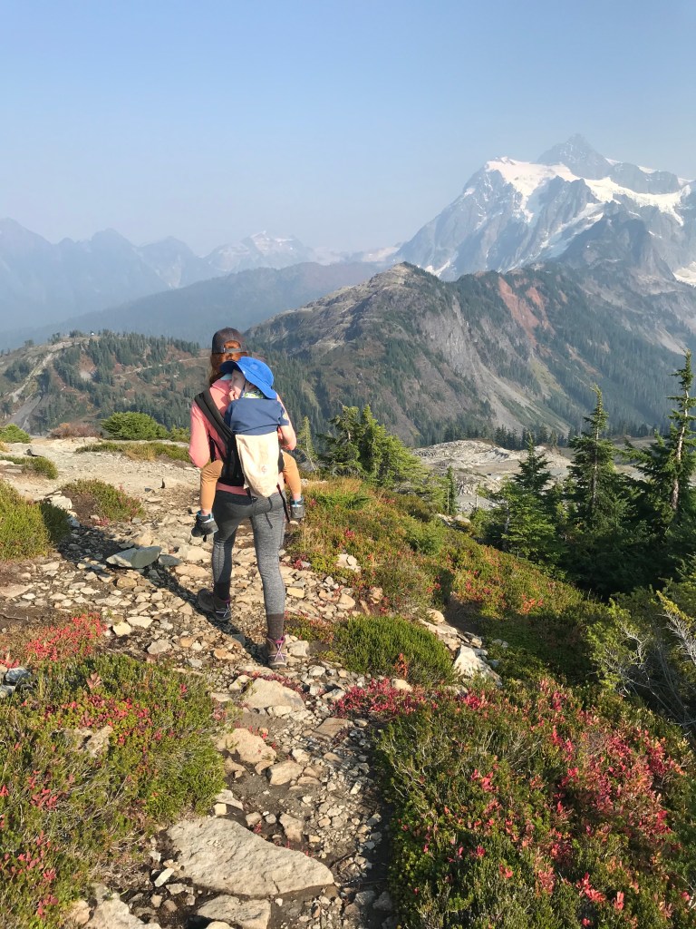 We drove up to the Artist Point parking lot and debated whether or not to do a full hike. Our kids weigh about 35 pounds each and I didn’t want to end up carrying them really far. We started down the Table Mountain trail which is rocky and not too steep to begin with. The kids were doing awesome hiking so right before we got to the steep part of the trail, Seth ran back to the car to get our kid carriers and water/snacks.