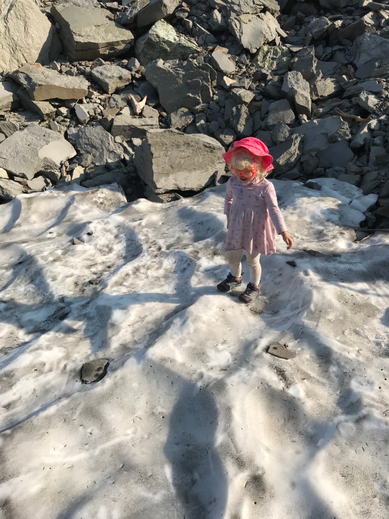 Eliza REALLY wanted to find snow because she remembered finding it last year…there was one very small patch still left next to the trail!